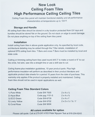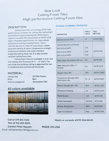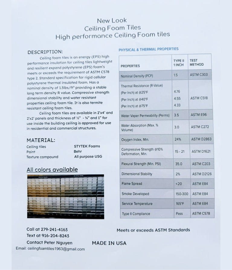 Ceiling foam tiles is an energy (EPS) high performance insulation for ceiling tiles lightweight and resilient expand polystyrene (EPS) foam's meets or exceeds the requirement of ASTM C578 type 2. Standard specification for rigid cellular polystyrene thermal insulated foam. Has a nominal density of 1.5lbs/ft' providing a stable long term density R value. Compressive strength dimensional stability and water resistant properties ceiling foam tile. It is also termite resistant ceiling foam tiles.